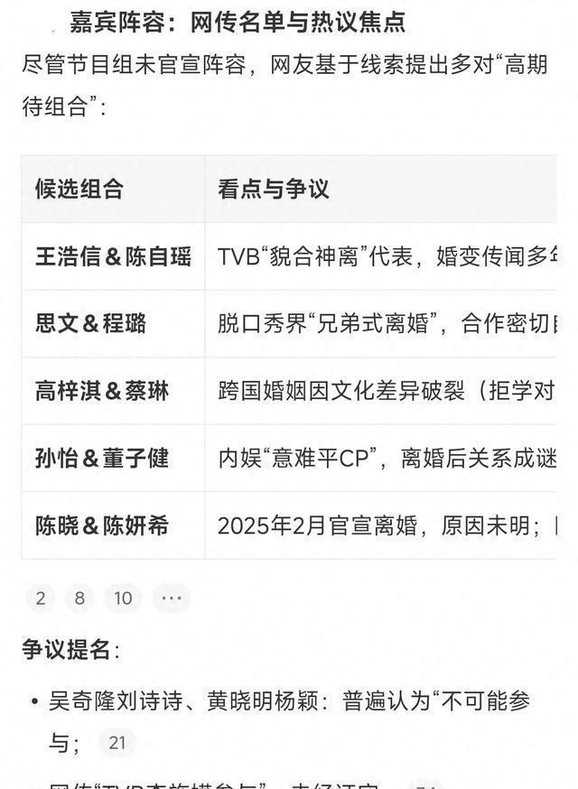 光看到网友呼声最高的这几个名单,就已经够兴奋了! 王浩信vs陈自瑶 这对是真抓马,婚离没离不知道,但是人是貌合神离了,